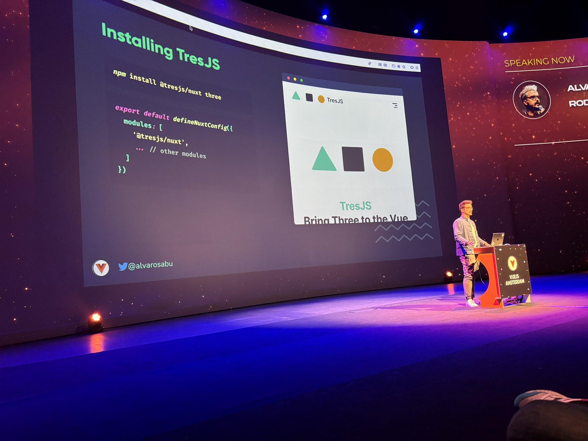 We had the opportunity to present a talk at VueJS Amsterdam stage titled "The Subtle art of 3D Scrolly-telling and Product-Customisation with TresJS" to show real-world usecases of TresJS. Our goal was to show the audience how easy is to create 3D scenes with Vue, which previously was a intimidating task, now something available for everyone to try ๐.